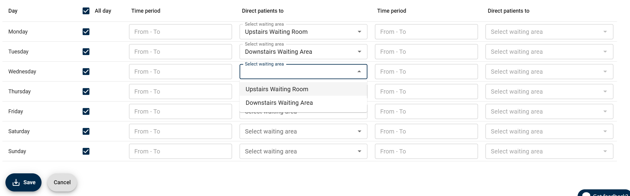 With this set you will only be able to interact with one of the "Direct patient to" drop downs for each day, to select that day's waiting area.
