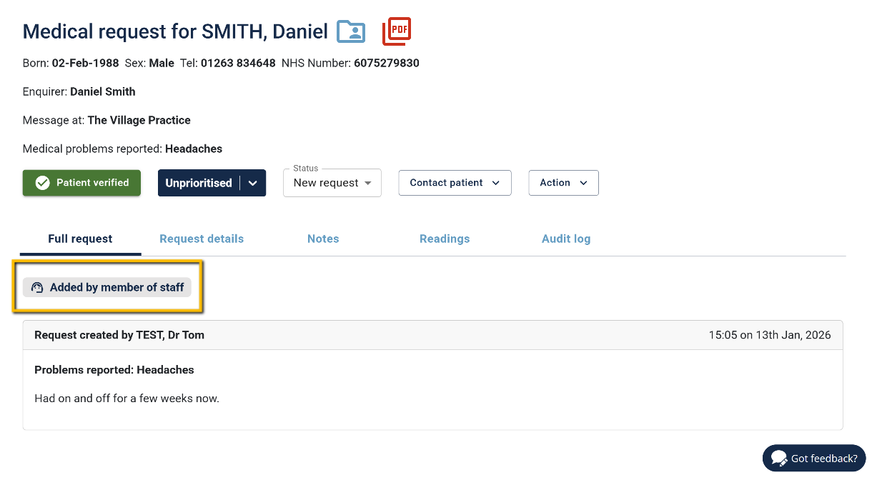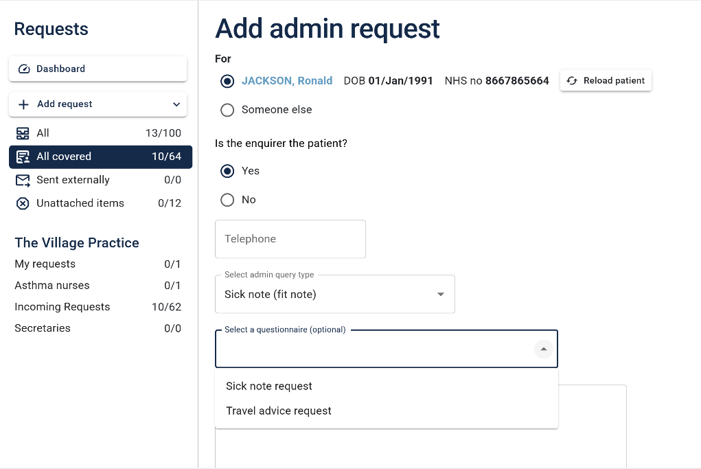 Your staff will then be able to complete the questionnaire on behalf of the patient and submit the request, ensuring that information is captured in a standard way.